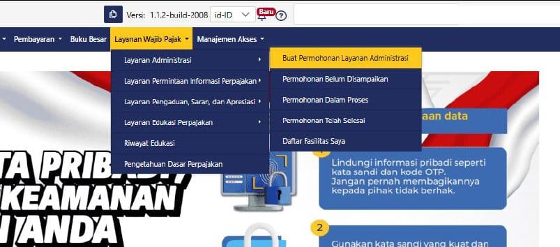 Navigasi Menu: Dari dashboard, pilih modul “Layanan Wajib Pajak” dan kemudian menu “Layanan Administrasi”. selanjutnya, pilih submenu “Buat Permohonan Layanan Administrasi”.