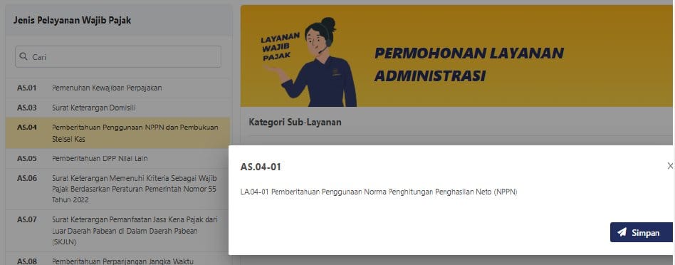 Pilih Jenis Layanan: Cari dan pilih Kategori Layanan “LA.04 Pemberitahuan Penggunaan NPPN dan Pembukuan Stelsel Kas”, kemudian Kategori Sub Layanan “AS.04-01 Pemberitahuan penggunaan Norma Penghitungan Penghasilan Neto (NPPN)” kemudian klik “Simpan”