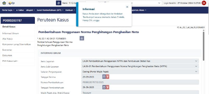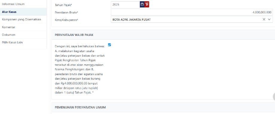 Pengisian Formulir: Isi formulir pada grid “Alur Kasus”. Pada bagian “Tahun Pajak”, pilih Tahun Pajak, misalnya “2025”. Lalu isi Peredaran Bruto dalam setahun, kemudian pilih “Kota/Kabupaten” tempat diajukannya pemberitahuan, serta centang “Pernyataan Wajib Pajak”.