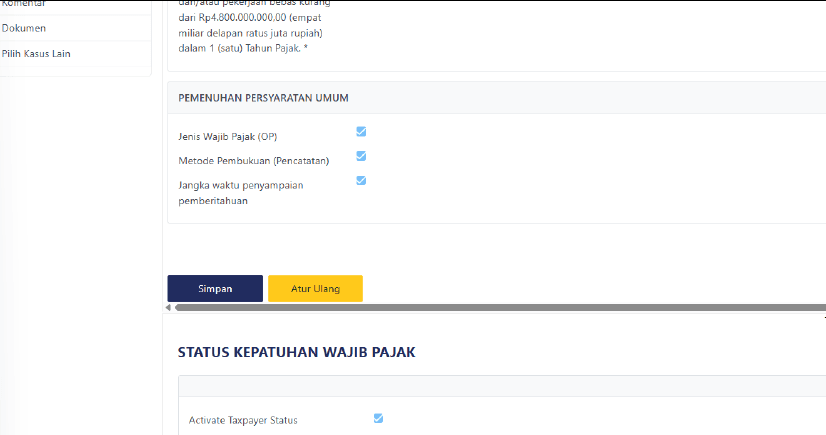 Validasi Otomatis & Submit: Setelah semua data terisi, sistem Coretax akan melakukan validasi “PEMENUHAN PERSYARATAN UMUM” dan status kepatuhan Wajib Pajak. Jika memenuhi, Wajib Pajak dapat melanjutkan proses dan menekan tombol “Kirim”. Kemudian klik tombol “Simpan”